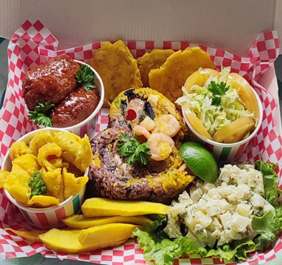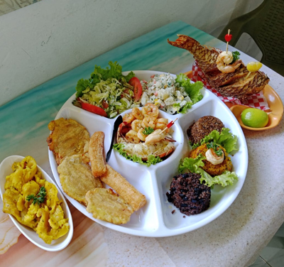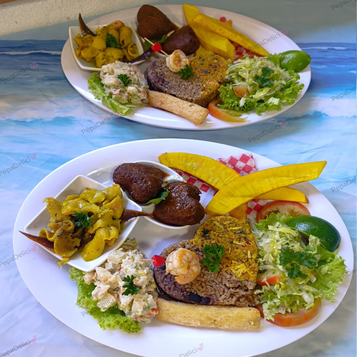 (Personal Mixed Platter). Albóndiga de pescado, Caracol al ajo, Arroz con mariscos, Arroz con coco, Arroz con frijoles, Churrasco de res, Ensalada rusa, Fruta de pan