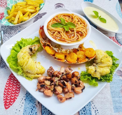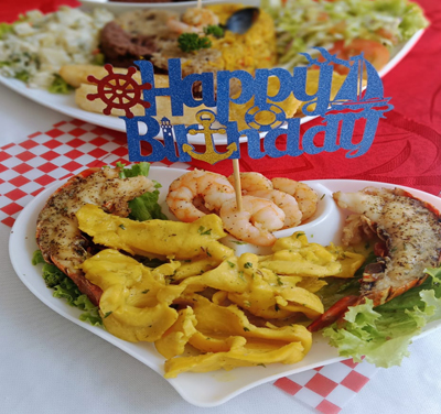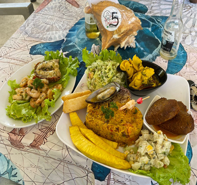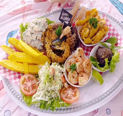 (Express Mixed Seafood Platter). Albóndiga de pescado, Camarones, Langosta, Caracol, Arroz de mariscos, Arroz con coco, Ensalada rusa, Fruta de pan o patacones